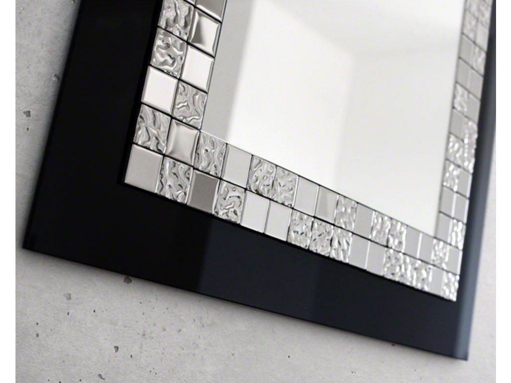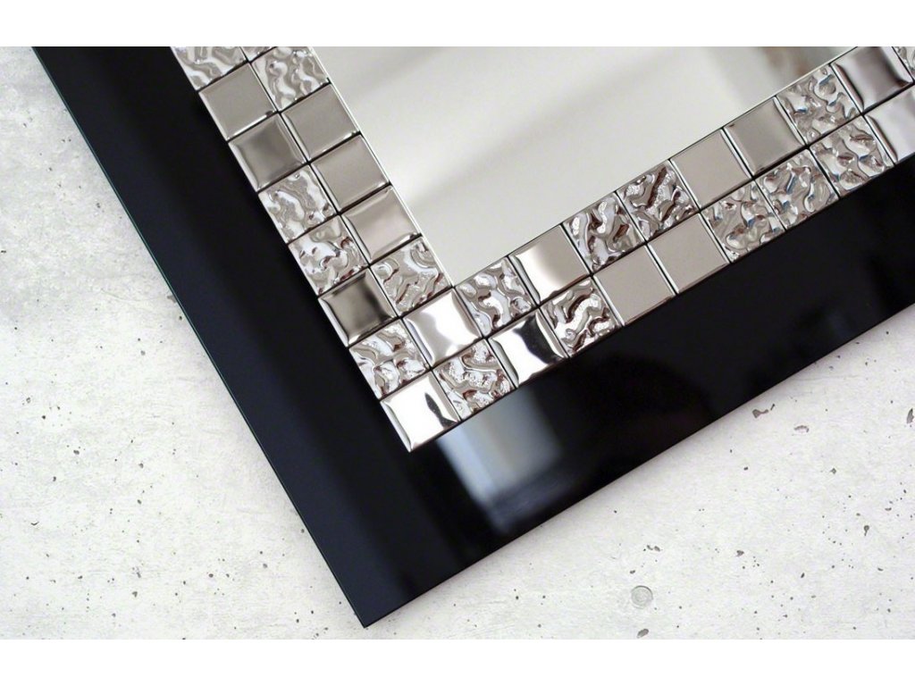Elegantné nástenné zrkadlo v štýle Glamour pôsobí honosne a prepychovo. Zosobňuje najnovšie trendy v oblasti dekorovania interiéru. Rám je vyrobený z čierneho skla Lacobel a kvalitnej sklenenej striebornej mozaiky. Zrkadlo je zabezpečené teflónom, ktorý ho chráni pred korozívnym účinkom vlhkosti - vhodné i do kúpeľne.Zrkadlo sa zhotovuje na zákazku, je možné vyrobiť aj iný rozmer. Zrkadlá sú vyrobené z tých najkvalitnejších belgických zrkadiel s vysokou priepustnosťou a leskom. Brúsenie a leštenie hrán je vykonávané na kvalitných talianskych strojoch pre spracovanie skla.