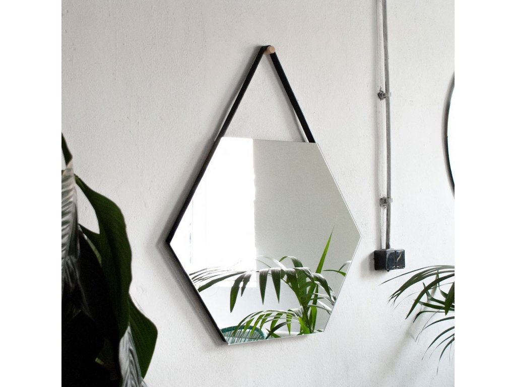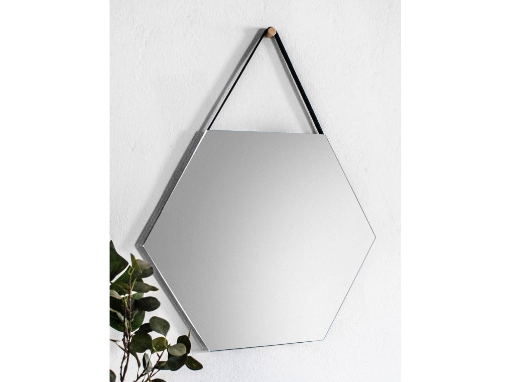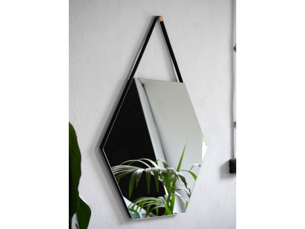 Originálne šesťuholníkové nástenné zrkadlo dokonale skrášli interiér v modernom, škandinávskom alebo priemyselnom štýle. Ideálne sa hodí kúpeľne, obývacej izby či spálne. Zrkadlo je zavesené na koženom remeni /prírodná koža/ v čiernom prevedení. Je chránené pred korozívnym účinkom vlhkosti - vhodné i do kúpeľne. Súprava obsahuje drevený vešiak na zavesenie zrkadla.Zrkadlá sú vyrobené z tých najkvalitnejších belgických zrkadiel s vysokou priepustnosťou a leskom. Brúsenie a leštenie hrán je vykonávané na kvalitných talianskych strojoch pre spracovanie skla.