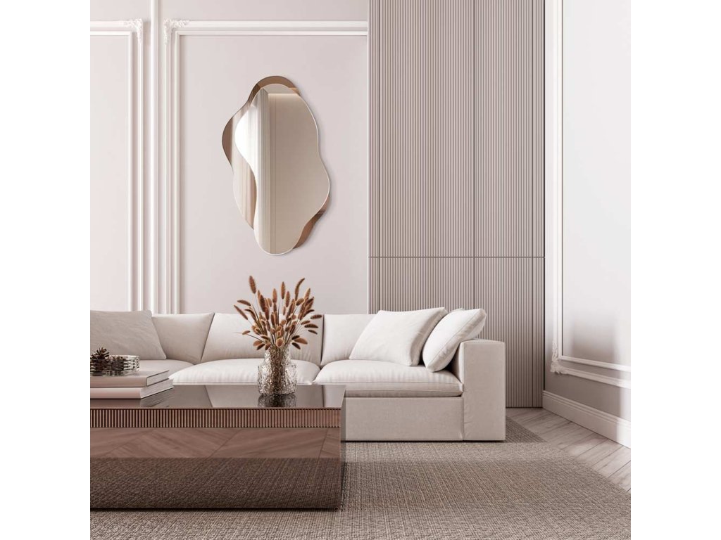 - Nepravidelný rám zrkadla Libido je vyrobený z hnedého skla Lacobel. Jeho okraje sú brúsené a leštené. Hnedá farba sa pri umývaní neodiera ani nepoškriabe. Toto zrkadlo je vhodné aj do kúpeľne.