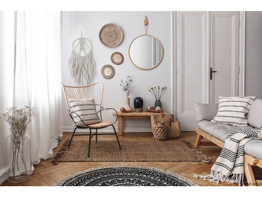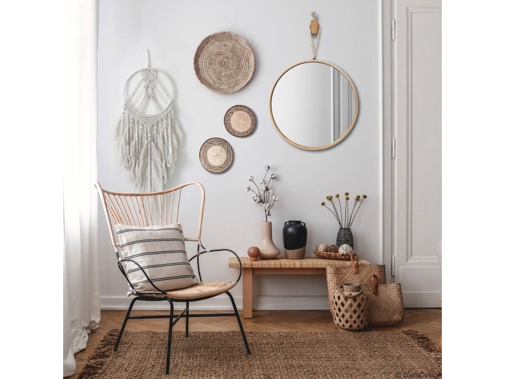 Okrúhle nástenné zrkadlo na šnúrke v preglejkovom brezovom ráme je zalakované tvrdým čírym matným lakom. Aj keď je jednoduché, je krásne. Perfektne sa hodí do obývacej izby, spálne alebo haly nad komodu zo svetlého dreva. Ide o interiérovú výzdobu v škandinávskom alebo ekologickom štýle, ale hodí sa aj do moderných a priemyselných interiérov, najmä tých v prírodnom prevedení.Rám zrkadla je vyrobený z kvalitnej preglejky, lakovaný dvojzložkovým polyuretánovým lakom. Do nej je nalepené zrkadlo s vysokým leskom, zavesené je na jutovej šnúrke.