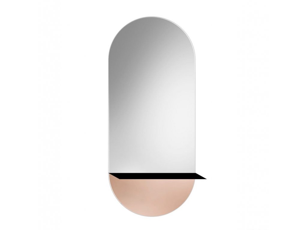 Moderné kúpeľňové zrkadlo zo zbierky zrkadiel Novi je fúziou farieb a materiálov. Kombinuje zrkadlá s rôznymi farbami a vzormi. Hlavná časť tohto modelu je vyrobená z kvalitných belgických zrkadiel a je doplnená farebným medeným zrkadlom. Tieto dve zrkadlá medzi sebou oddeľuje kovová čierna polička.