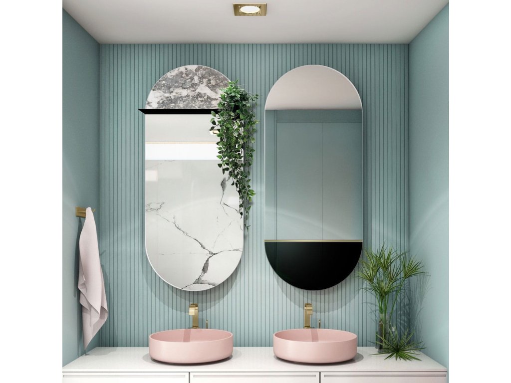 Moderné kúpeľňové zrkadlo zo zbierky zrkadiel Novi je fúziou farieb a materiálov. Kombinuje zrkadlá s rôznymi farbami a vzormi. Hlavná časť tohto modelu je vyrobená z kvalitných belgických zrkadiel a je doplnená farebným zeleným zrkadlom . Tieto dve zrkadlá medzi sebou oddeľuje kovová čierna polička.