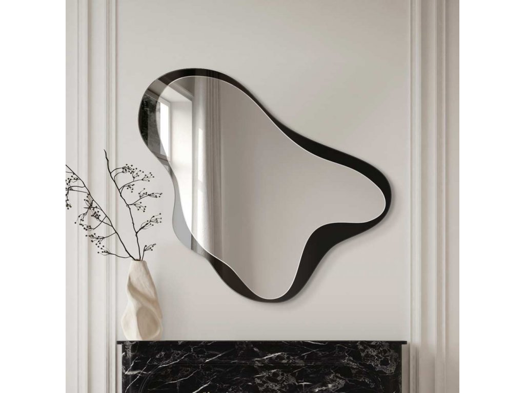 - Nepravidelný rám zrkadla Obses je vyrobený z čierneho skla Lacobel. Jeho okraje sú brúsené a leštené. Čierna farba sa pri umývaní neodiera ani nepoškriabe. Toto sklo je vhodné aj do kúpeľne.