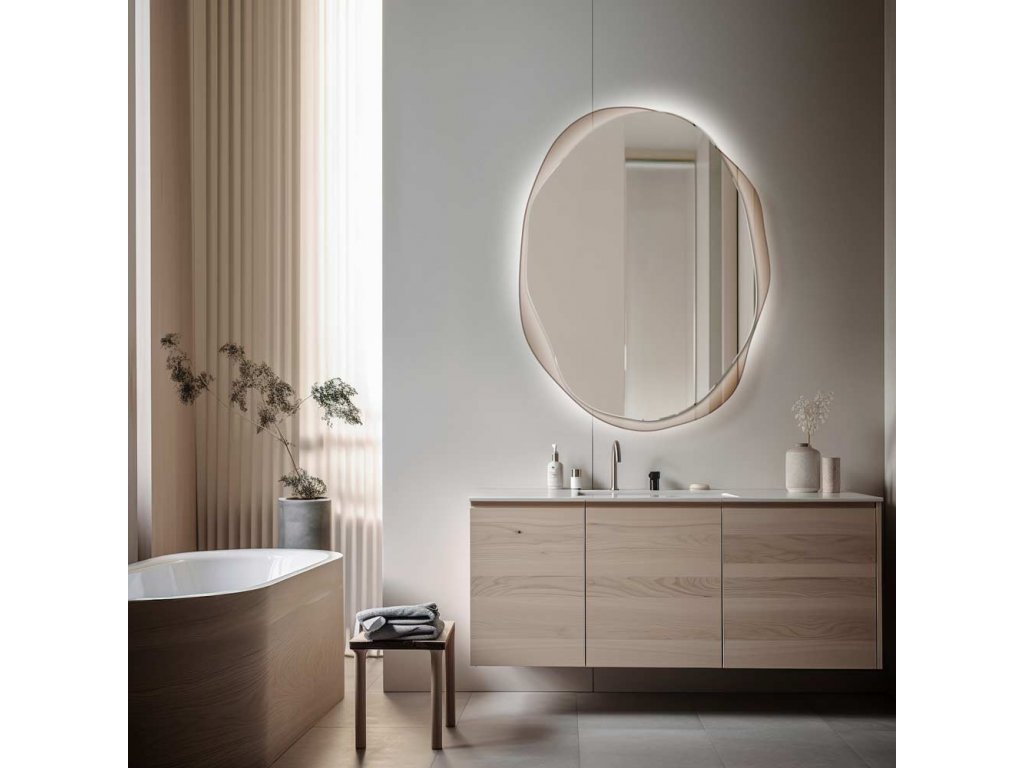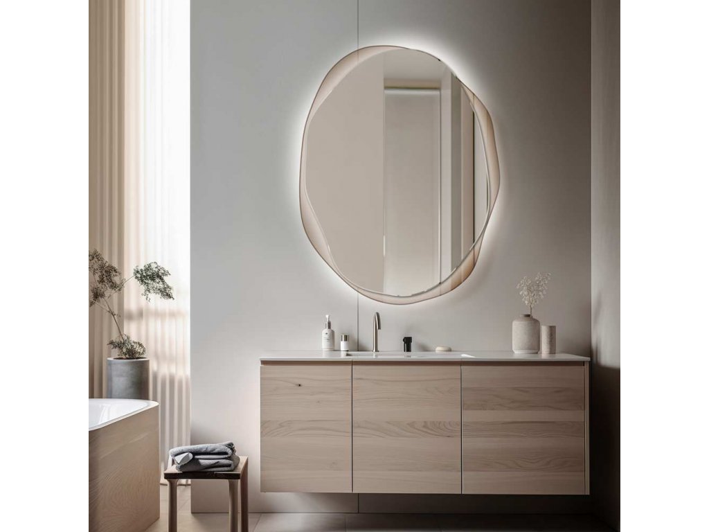 - Nepravidelný rám zrkadla Osmo je vyrobený z dymového bronzového skla. Jeho okraje sú brúsené a leštené. Toto zrkadlo je vhodné do kúpeľne.