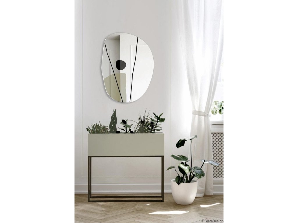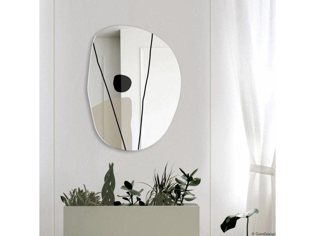 Originálne dekoratívne nástenné zrkadlo s nepravidelným organickým tvarom. Zo spodnej časti zrkadla sa tiahne originálny vyleptaný a maľovaný vzor ( nezotiera a nezmýva sa ). Originálna dekorácia do obývacej izby, haly alebo spálne. Vyzerá perfektne v moderných a eklektických interiéroch.