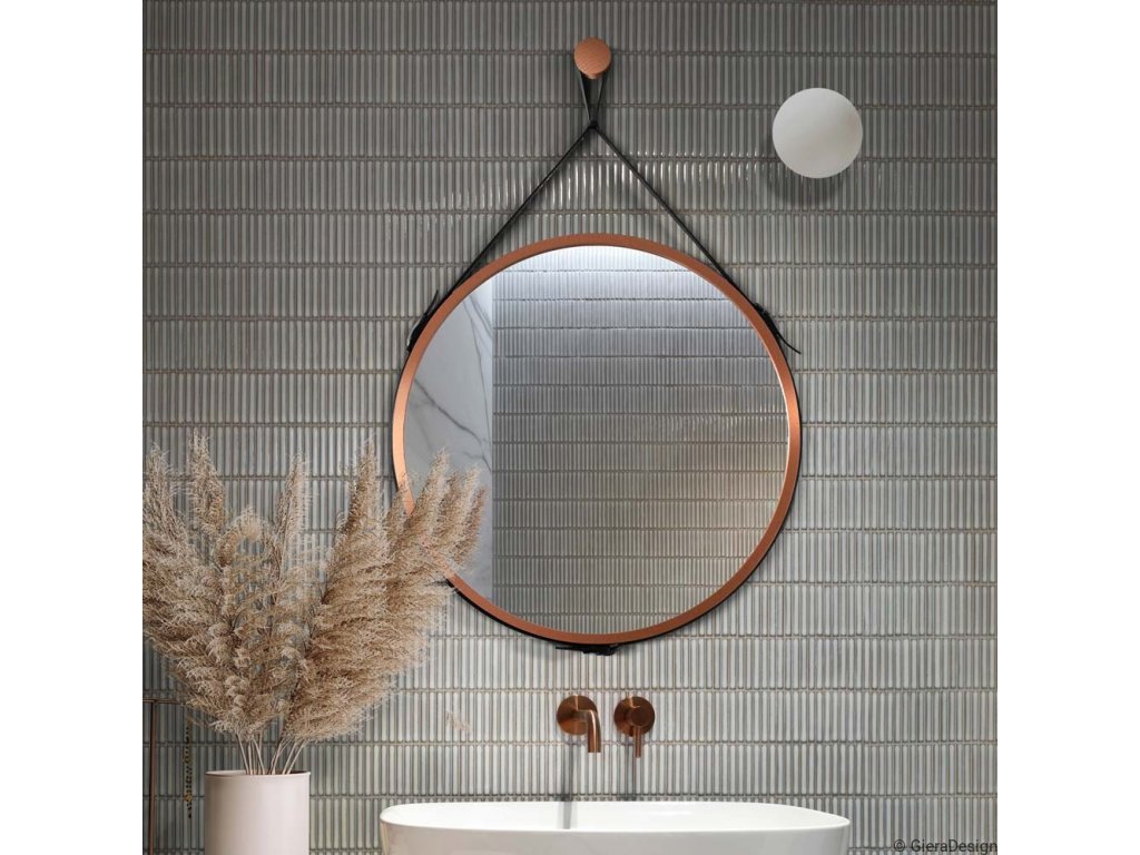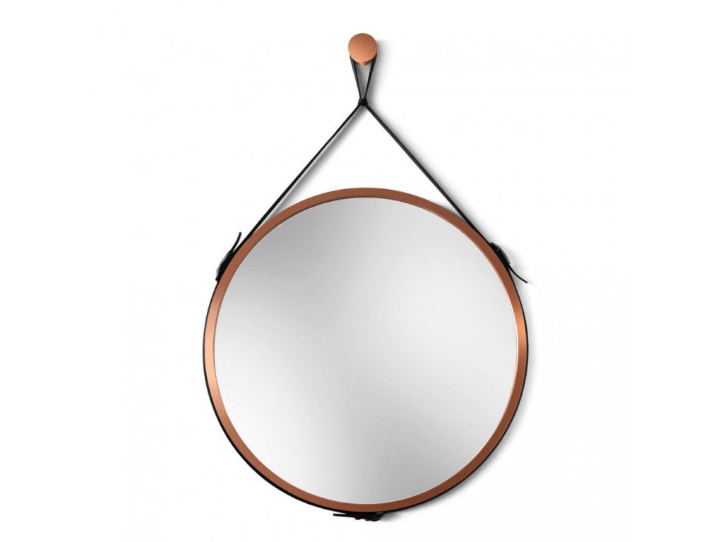 Okrúhle nástenné zrkadlo v tenkom medenom ráme je zavesené na koženom remienku. Jednoduché a elegantné zrkadlo bude ozdobou každého priestoru. Je to dekoratívny model, takže sa bude perfektne hodiť do obývacej izby, spálne, haly, ako aj do kúpeľne. Perfektne ladí so škandinávskym, loftovým alebo minimalistickým štýlom interiéru.