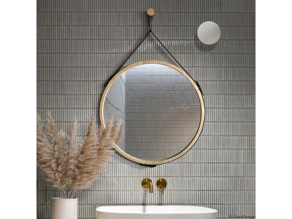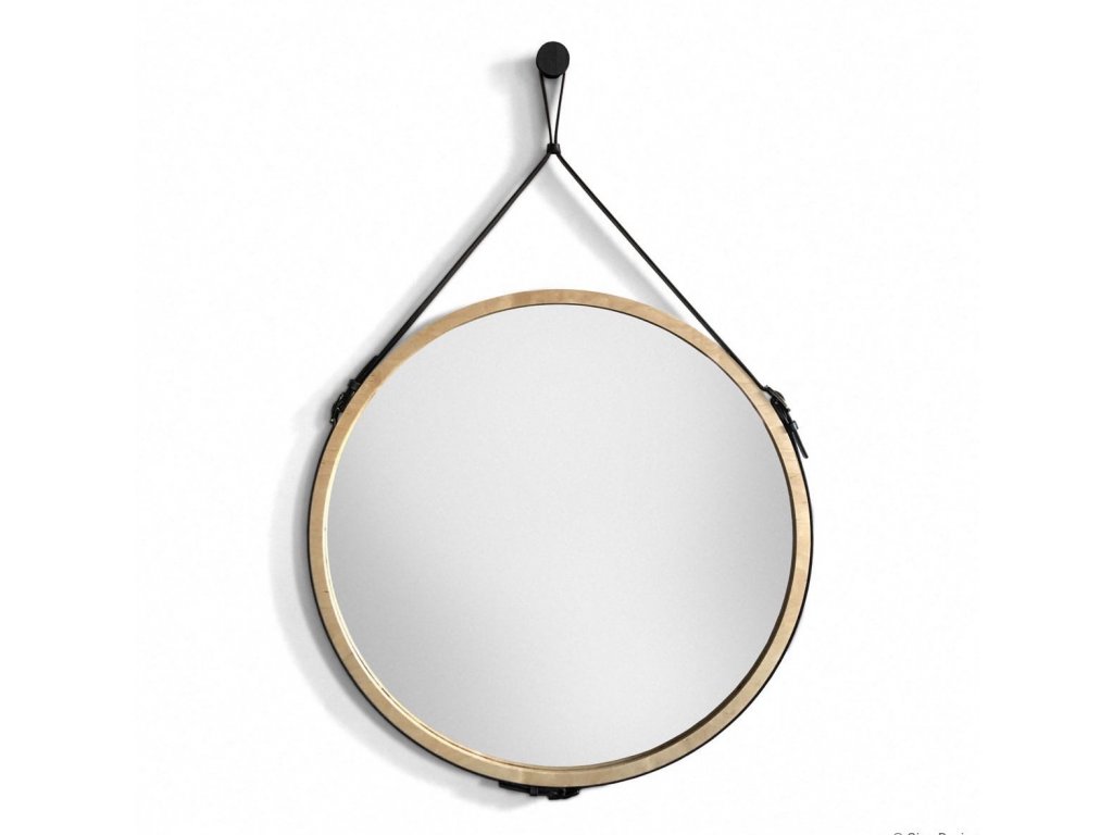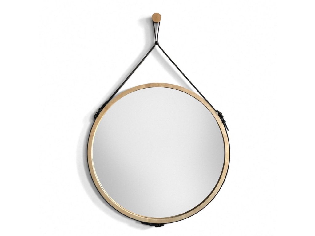 Moderné okrúhle nástenné zrkadlo v ráme z brezovej preglejky, zavesené na kvalitnom koženom remeni. Ideálne do škandinávskych, loftových alebo minimalistických štýlov interiéru.