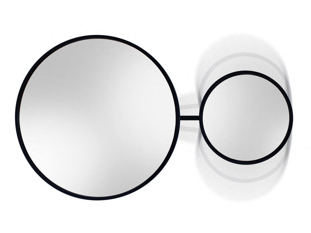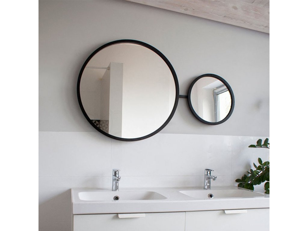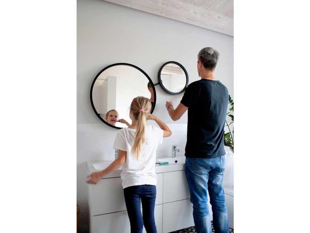 Unikátne, otočné, okrúhle zrkadlo vhodné pre celú rodinu. Pre ňu, pre neho, pre dieťa - unikátny rotačný systém umožňuje natočenie zrkadla tak, aby ho pohodlne používali všetci členovia domácnosti (najmä ľudia s rôznou výškou). Rámy jednotlivých zrkadiel sú vyrobené z vodeodolnej MDF lakovanej na čierno tvrdým dvojzložkovým polyuretánovým lakom. Zrkadlo je zabezpečené vrstvou teflónu, ktorá ho chráni pred korozívnymi účinkami vlhkosti. Na zadnej strane je namontovaný rotačný systém umožňujúci plynulé nastavenie zrkadla po jeho zavesení na stenu.