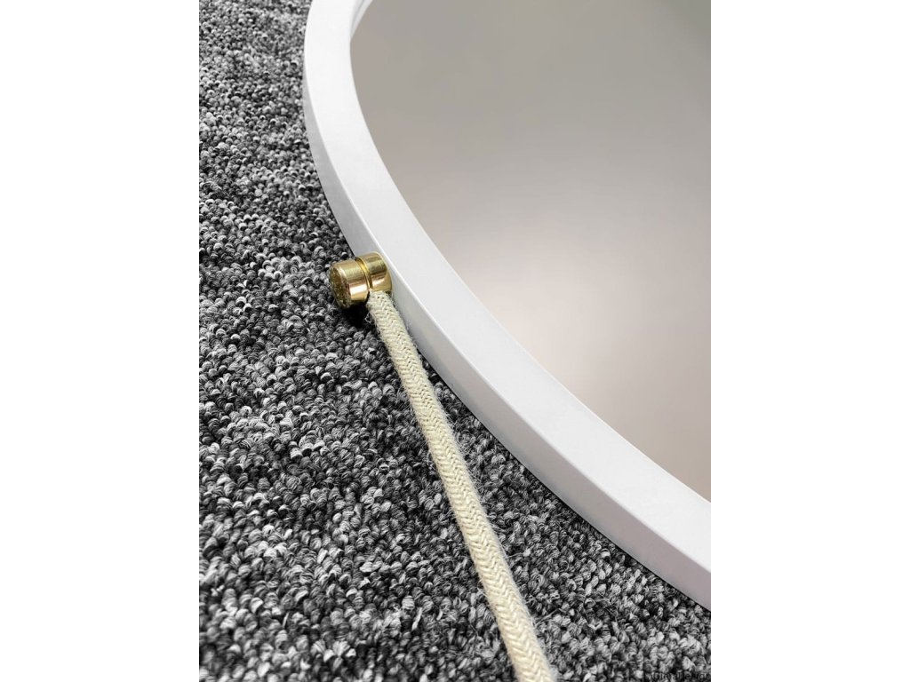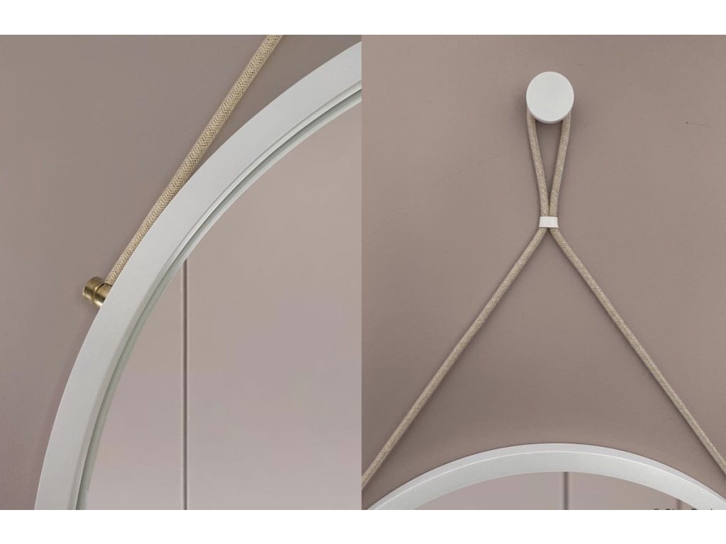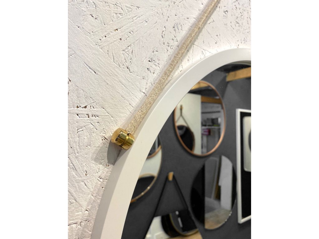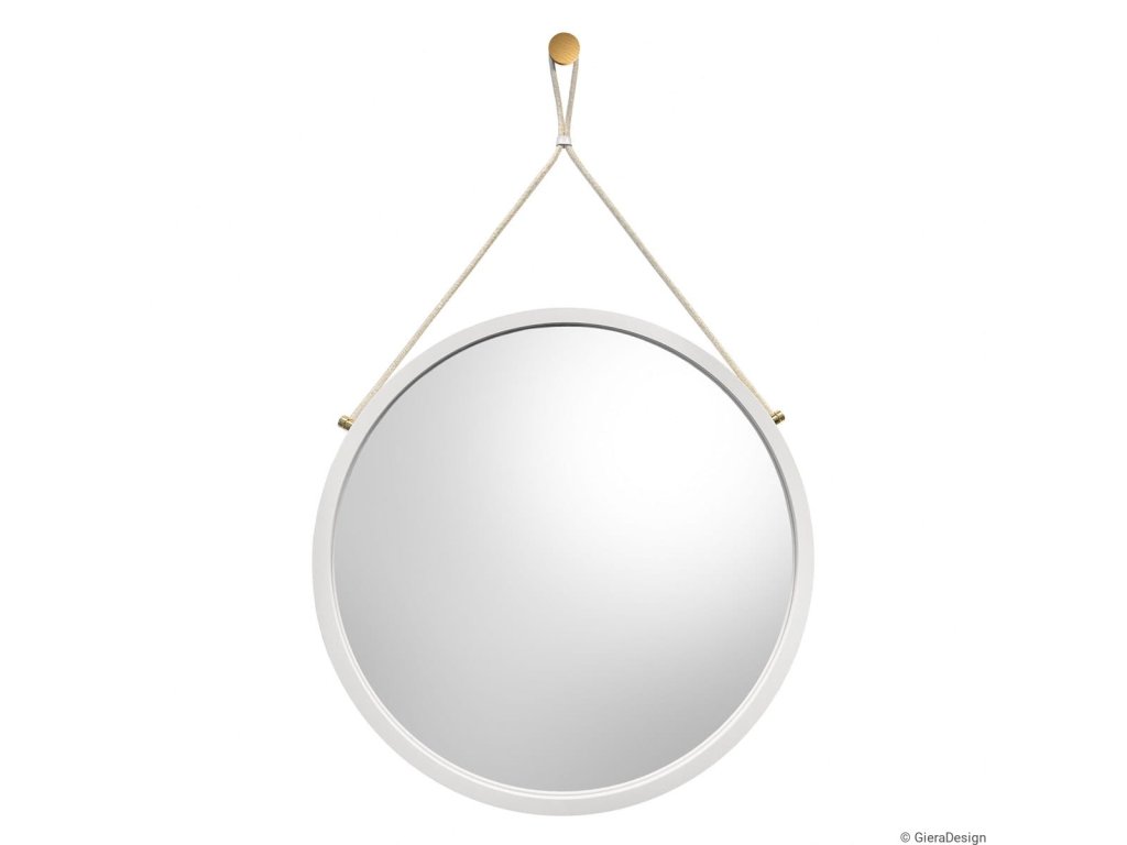 Minimalistické okrúhle zrkadlo v tenkom bielom ráme so zlatými bočnými úchytmi a krémovou šnúrkou. Ideálne do škandinávskych a moderných interiérov.Rám je vyrobený z vodeodolnej MDF dosky lakovanej tvrdým dvojzložkovým polyuretánovým lakom. Zrkadlo s vysokým leskom.