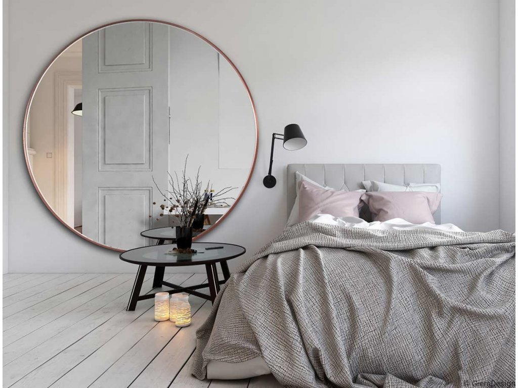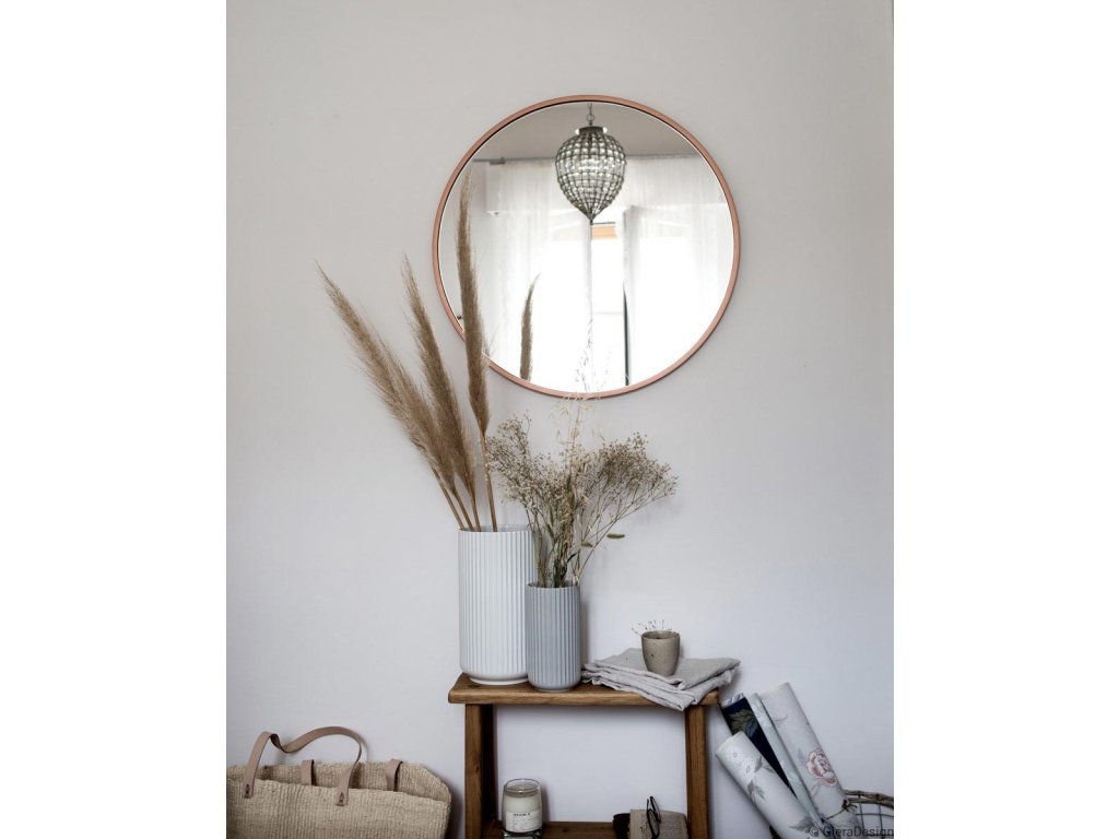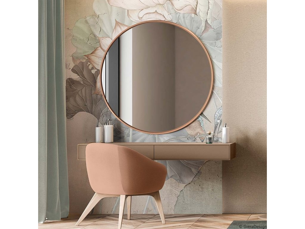 Okrúhle nástenné zrkadlo vo veľmi úzkom ráme v medenej farbe. Toto nadčasové zrkadlo predstavuje ideálny doplnok interiéru v modernom, škandinávskom alebo priemyselnom štýle. Tvorí krásnu dekoráciu obývacej izby, spálne, či kúpeľne.