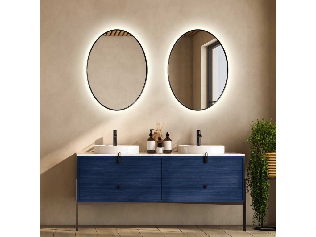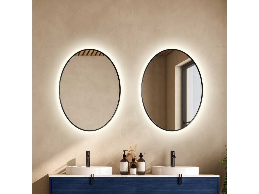 - Tenký 10 mm rám je vyrobený z vodeodolnej MDF dosky, lakovanej čiernym tvrdým metalickým lakom určeným do interiéru. Matná povrchová úprava. Zrkadlová doska bola nalepená bez narušenia lakového náteru (žiadne cvočky ani klince), čím sa zabezpečila dlhoročná vodotesnosť rámu. Spodná strana zrkadla je chránená teflónom, ktorý ho chráni pred korozívnymi účinkami vlhkosti. Rám je vhodný do kúpeľne.