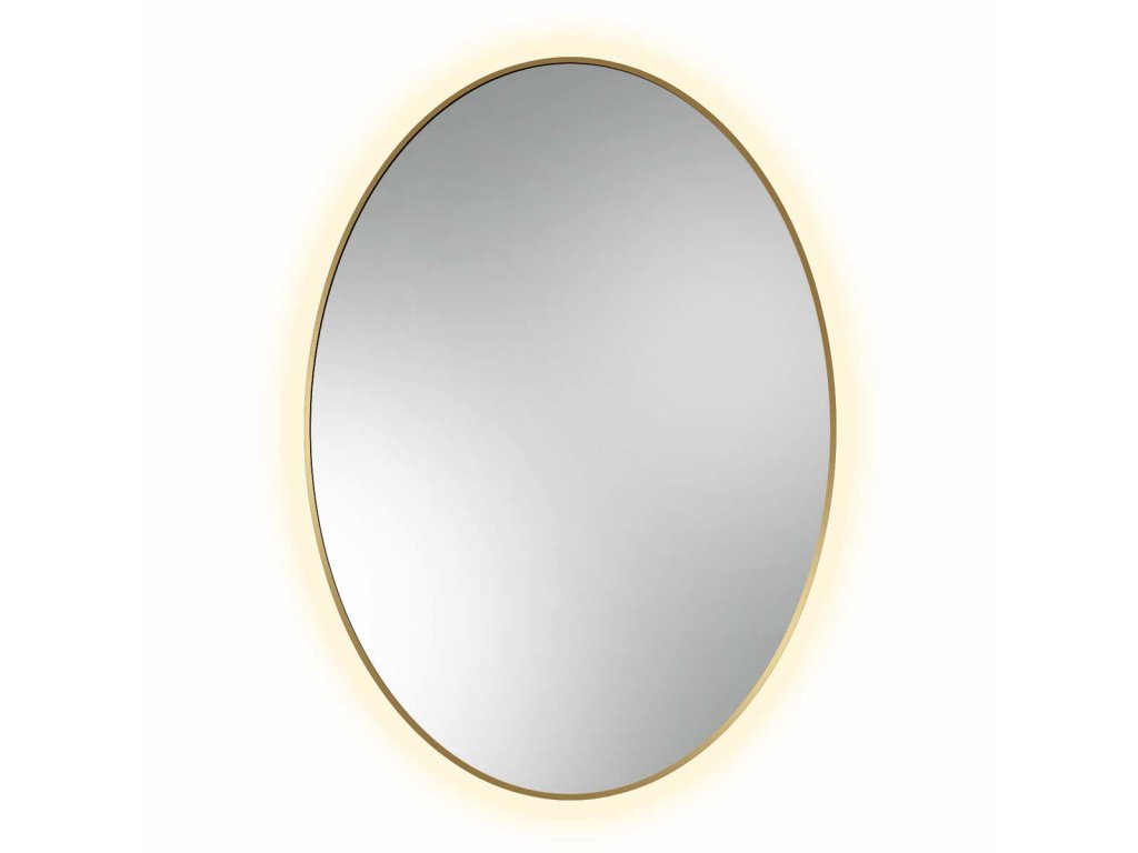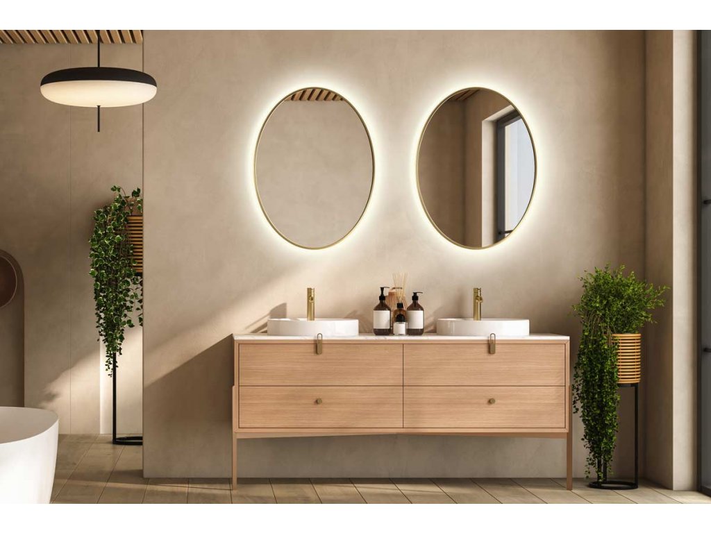 - Tenký 10 mm rám je vyrobený z vodeodolnej MDF dosky, lakovanej zlatým tvrdým metalickým lakom určeným do interiéru. Matná povrchová úprava. Zrkadlová doska bola nalepená bez narušenia lakového náteru (žiadne cvočky ani klince), čím sa zabezpečila dlhoročná vodotesnosť rámu. Spodná strana zrkadla je chránená teflónom, ktorý ho chráni pred korozívnymi účinkami vlhkosti. Rám je vhodný do kúpeľne.