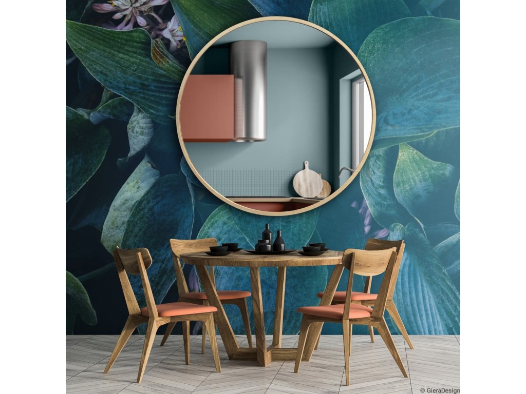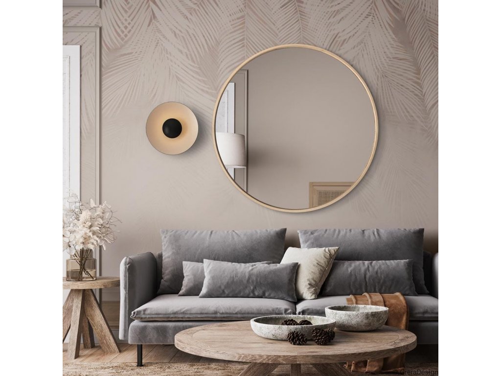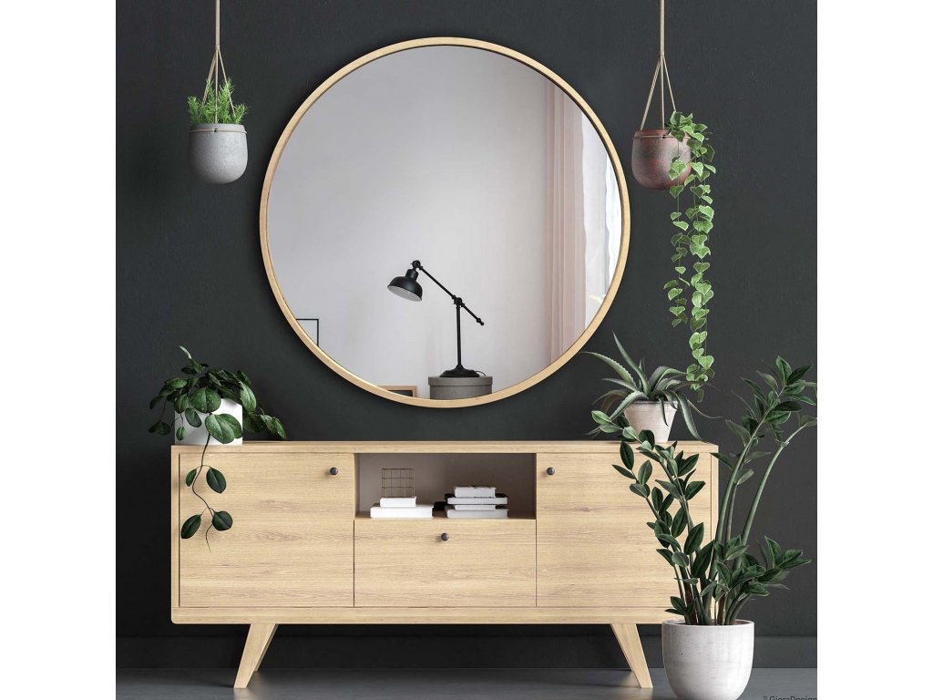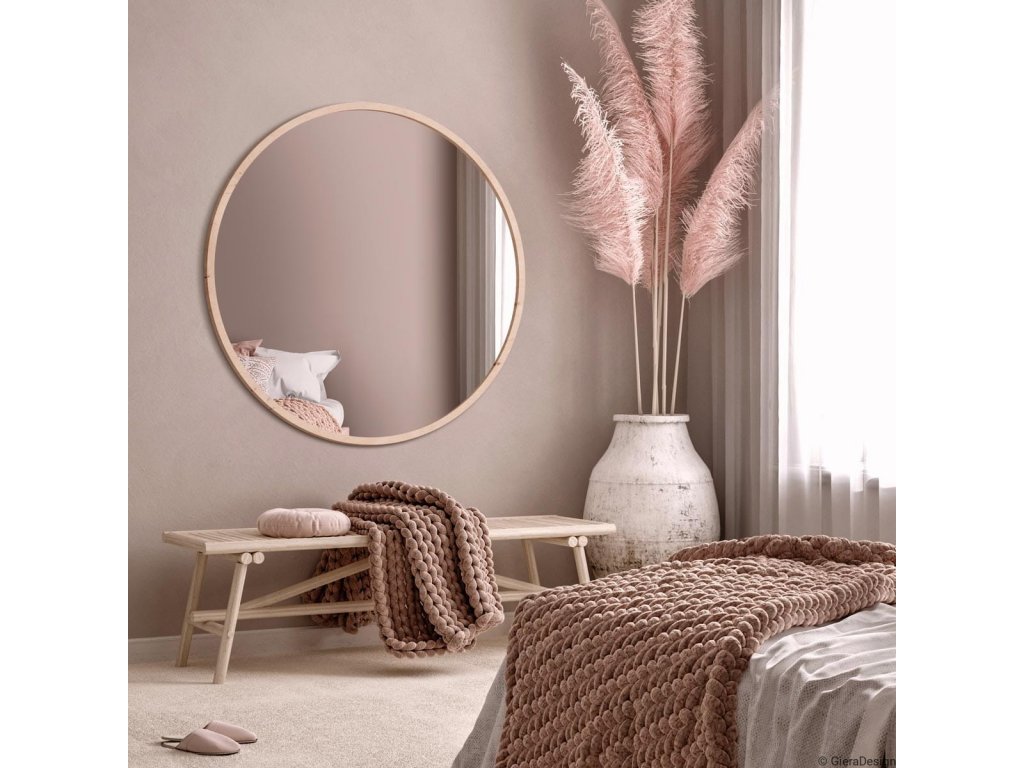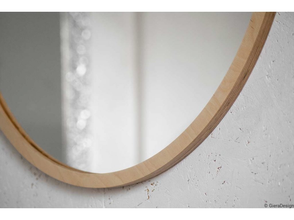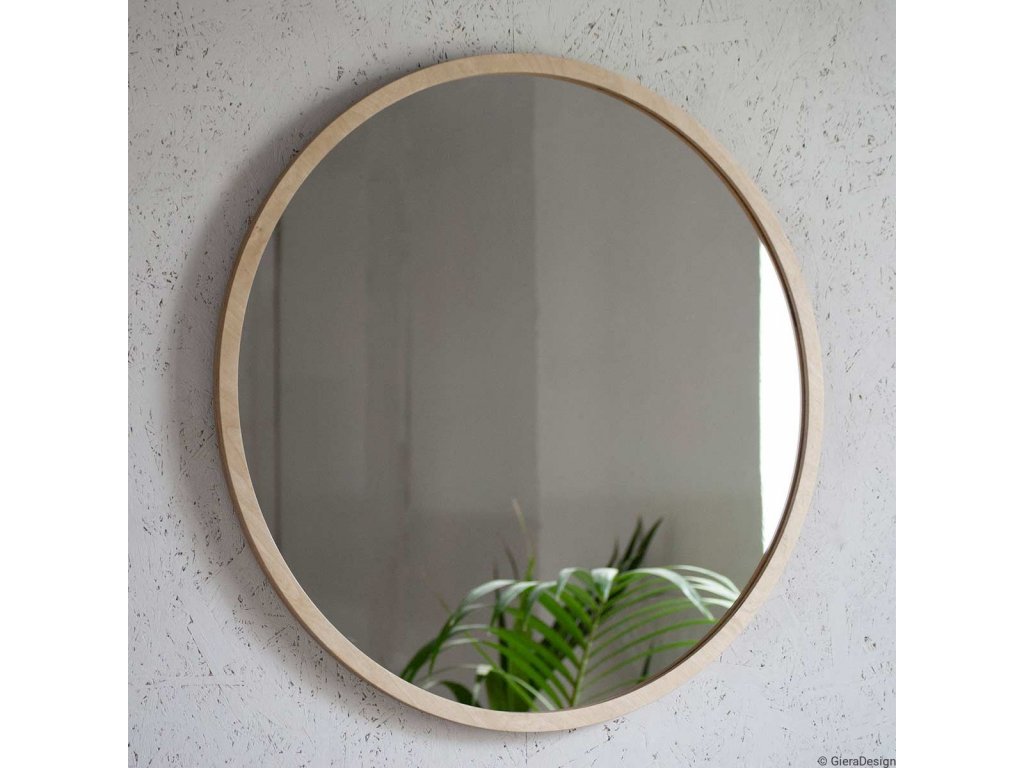 Naturálne okrúhle zrkadlo na stenu v tenkom ráme z preglejky. Toto moderné zrkadlo predstavuje ideálny doplnok interiéru v modernom, škandinávskom alebo priemyselnom štýle. Luxusné zrkadlo do obývačky.