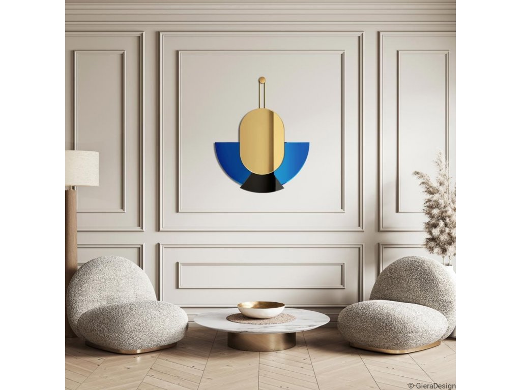 - Polkruhová časť zrkadla je modrá zrkadlová tabuľa kombinovaná so zlatou zrkadlovou tabuľou a čiernym sklom Lacobel.