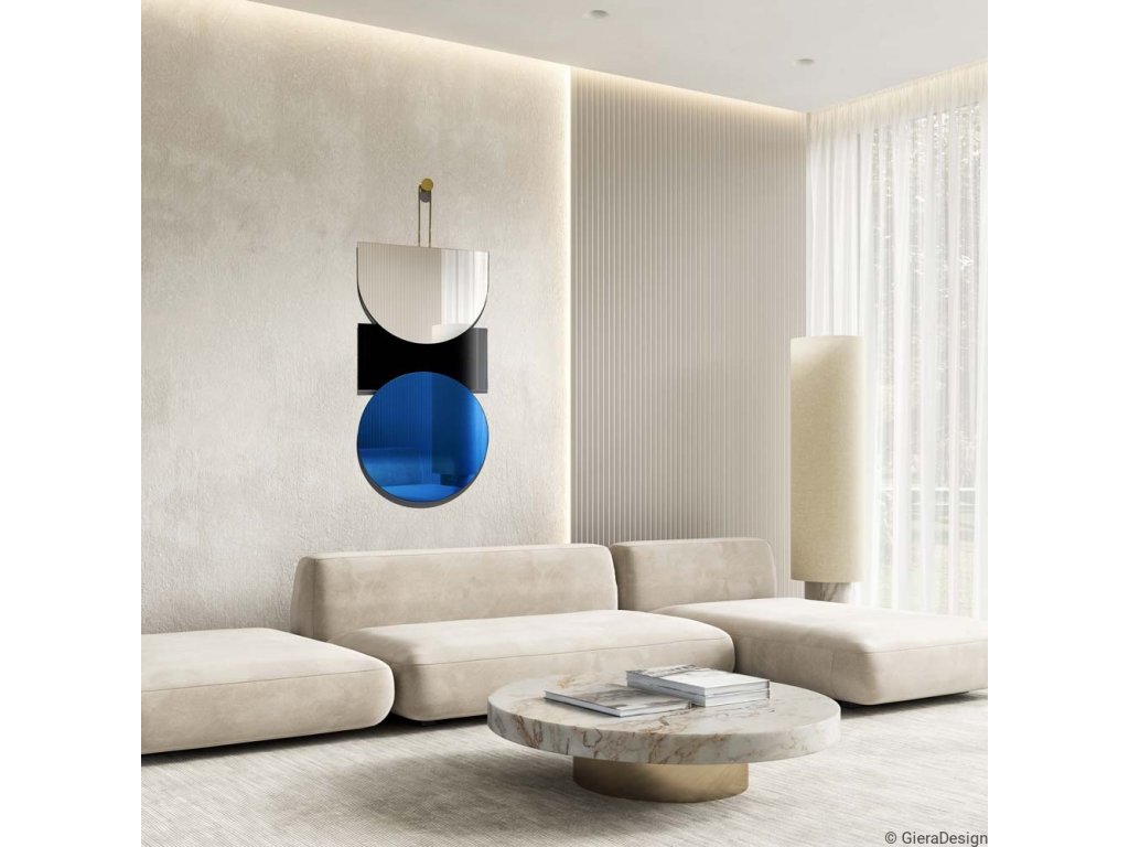 - Spodná časť zrkadla je modrá zrkadlová tabuľa kombinovaná s čiernym sklom Lacobel a klasickou zrkadlovou tabuľou.