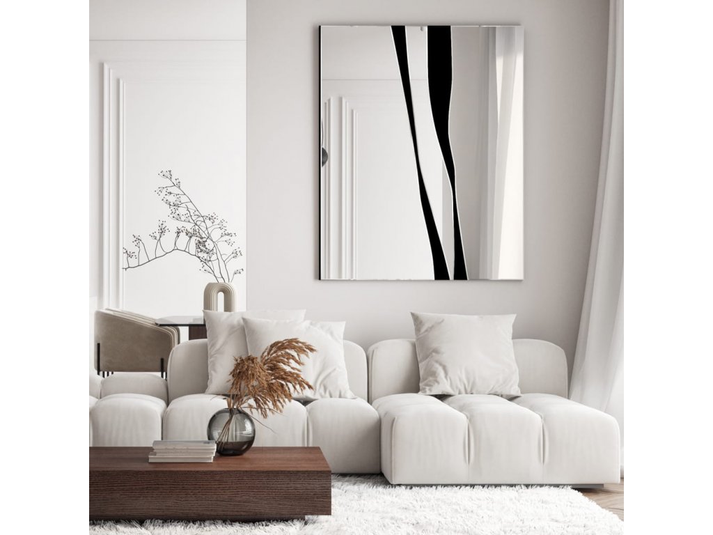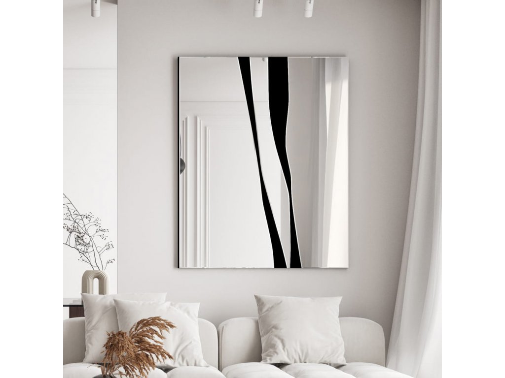 - Zrkadlo je nalepené na čiernej nábytkovej doske, ktorá je viditeľná medzi jednotlivými časťami zrkadla a vytvára originálny vzor.