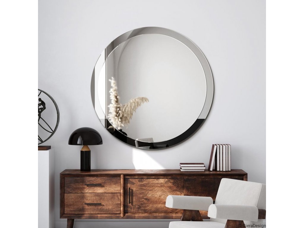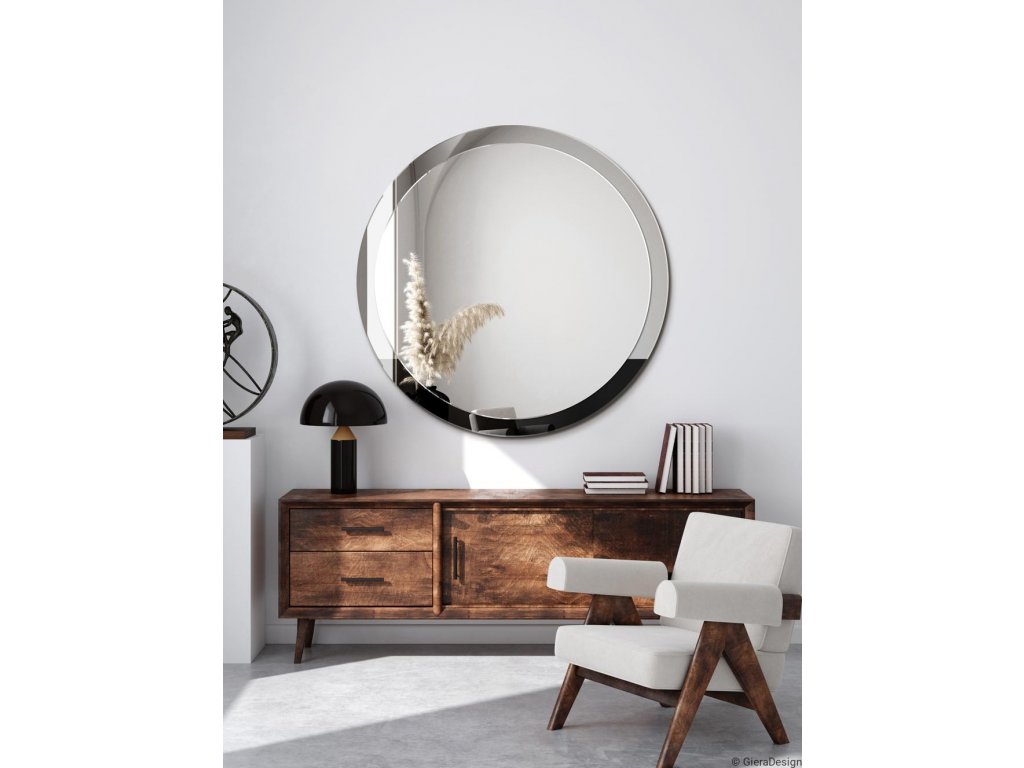 Elegantné, okrúhle nástenné zrkadlo s dvojfarebným rámom vhodné pre moderný interiér, ideálne aj pre interiér zariadený v eklektickom štýle. Hodí sa do obývacej izby, jedálne, spálne či do kúpeľne. Zrkadlo je vyrobené z dvoch zrkadlových tabúľ zlepených dohromady. Rám zrkadla tvorí grafitové zrkadlo, zozadu čiastočne natreté čiernou farbou. Farba je úplne odolná proti oderu. Okraje oboch zrkadiel sú brúsené a leštené. Zrkadlo je zabezpečené teflónom, ktorý ho chráni pred korozívnym účinkom vlhkosti - vhodné i do kúpeľne.Zrkadlo sa zhotovuje na zákazku, je možné vyrobiť aj iný rozmer. Zrkadlá sú vyrobené z tých najkvalitnejších belgických zrkadiel s vysokou priepustnosťou a leskom. Brúsenie a leštenie hrán je vykonávané na kvalitných talianskych strojoch pre spracovanie skla.