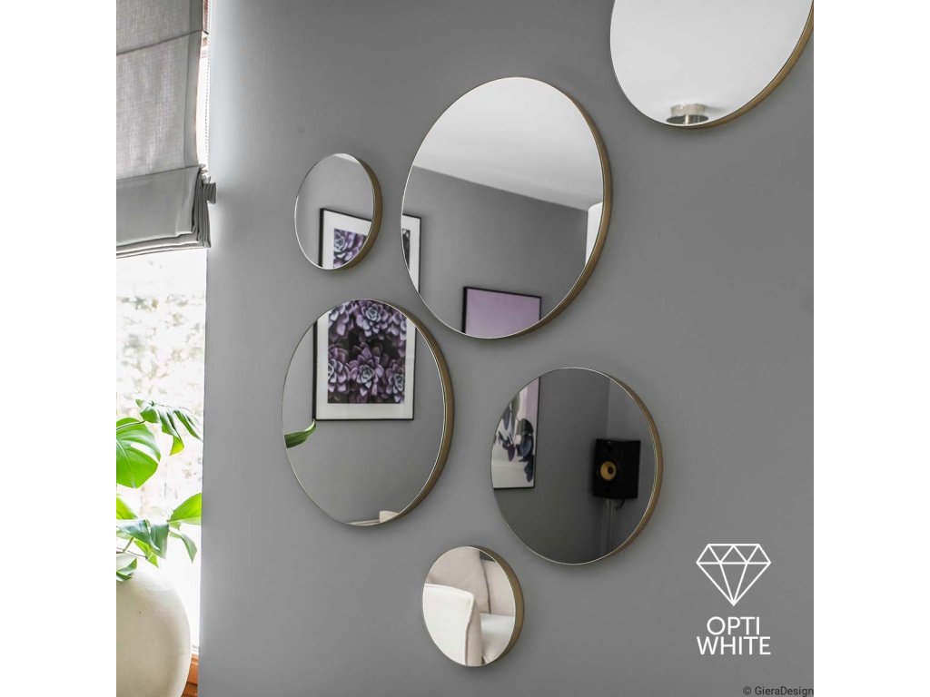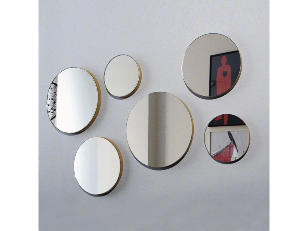 Sada troch okrúhlych zrkadiel troch veľkostí je vhodná na vytvorenie vlastnej kompozície. Rámy zrkadiel tvorí lakovaná, vode odolná MDF. Zrkadlo je zabezpečené pred korozívnym účinkom vlhkosti - vhodné i do kúpeľne. Zbrúsené a leštené okraje zrkadla sú samozrejmosťou.